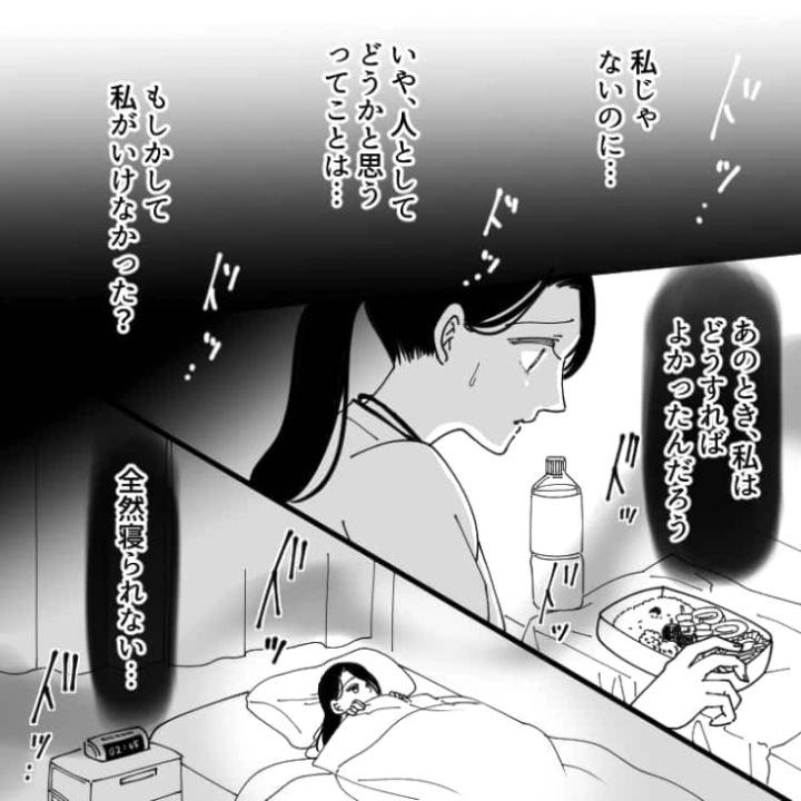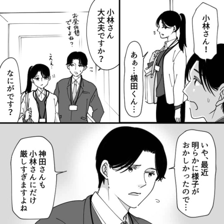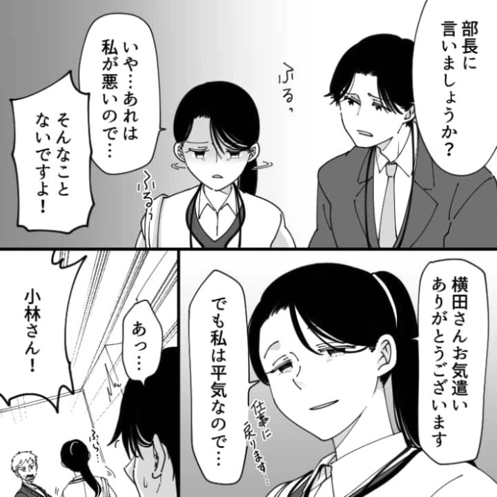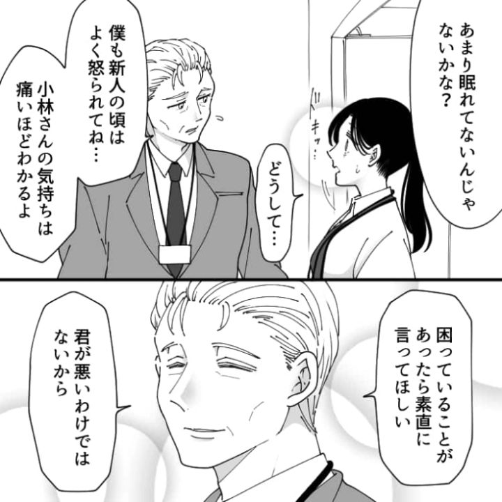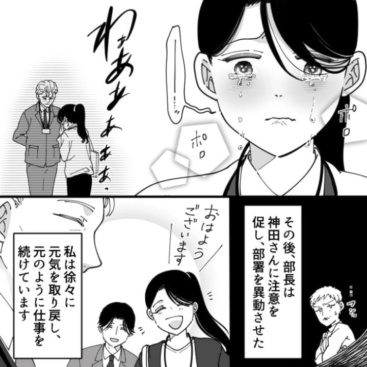 異変に気づいた部長が対処し、なんとか元気を取り戻せた主人公。「人としてどうかと思う」なんてモラハラにも程がありますよね。周囲に悩んでいる人がいたら話を聞いてあげて、悩みを溜めすぎることがないようにしたいものですね、