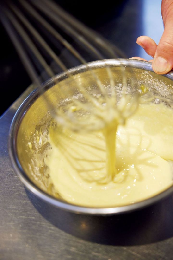 (2)ボールにバッター液の材料を入れ、泡立て器でなめらかになるまでよく混ぜる。