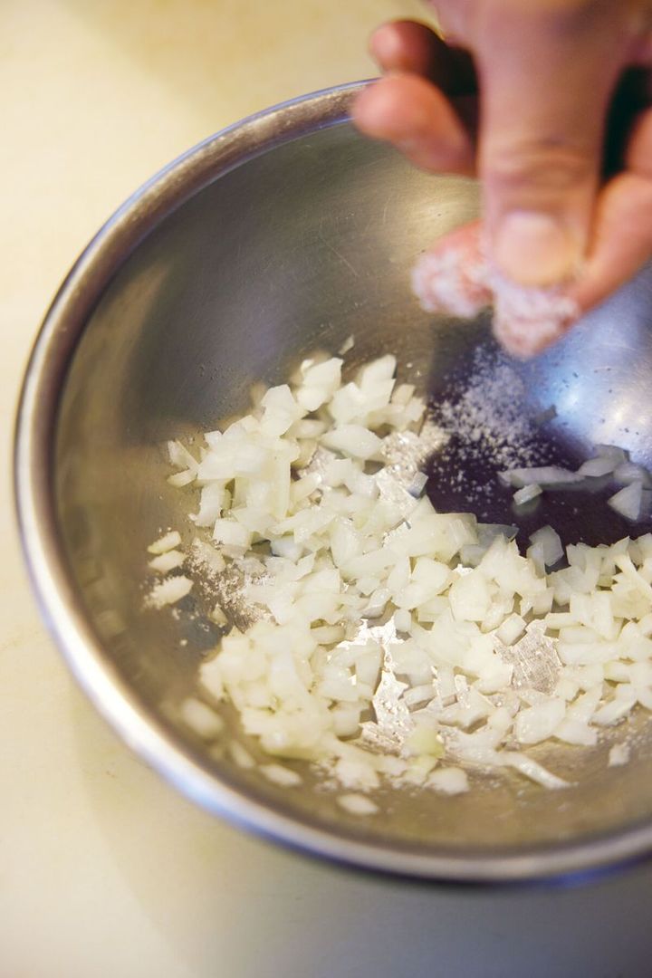 (1)玉ねぎの下ごしらえをする。ボールに玉ねぎを入れ、塩をふってまぶす。5分ほどおいてから洗ってざるに上げ、水けを絞ってボールに戻し入れる。