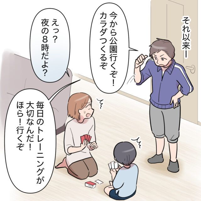 時間が遅いと言って止めても、夫は強引にアオイをトレーニングに連れて行きます。