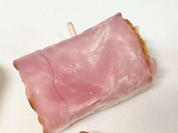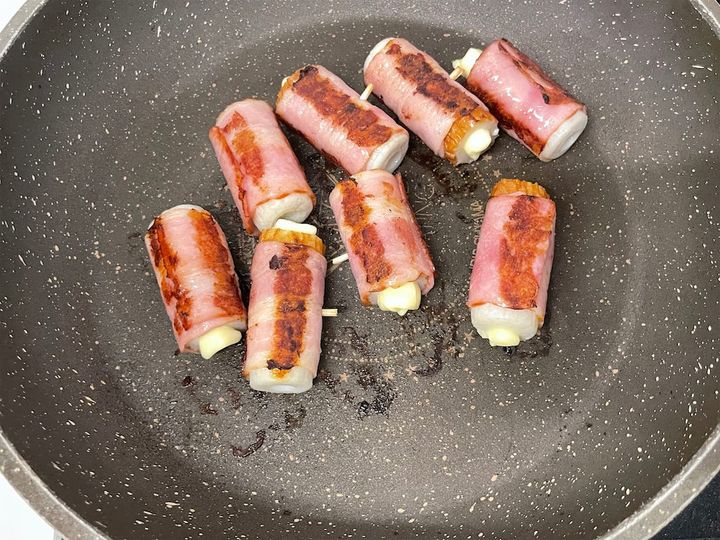 2. 1にベーコンを外側から巻き、爪楊枝を刺して巻き終わりを剥がれないようにします。