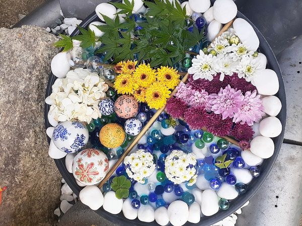 こちらの花手水は、全て長建寺のお嫁さまが心を込めて作成されております。