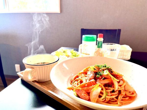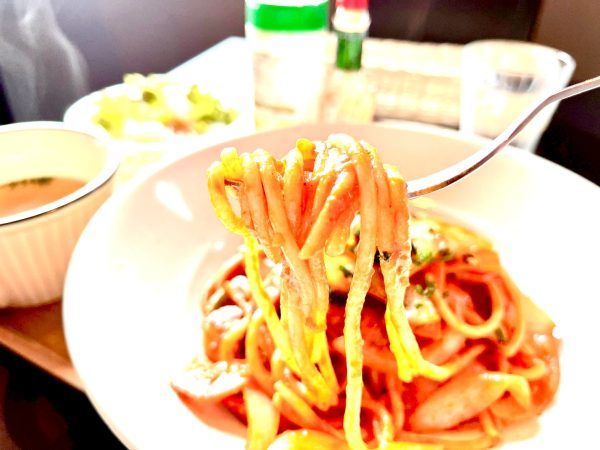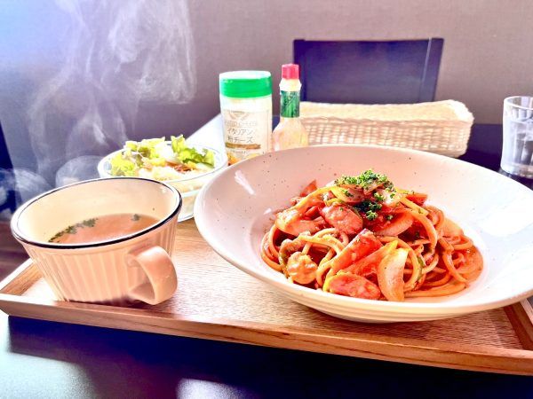 ベースには2種類のケチャップやお野菜を使用しているカフェ わだちさん特性ソースを使用しているとのこと。確かにナポリタンではあるのですが、トマトの酸味やその他のお野菜の旨味も感じられ、カフェ わだちさんの独自性を感じました。
