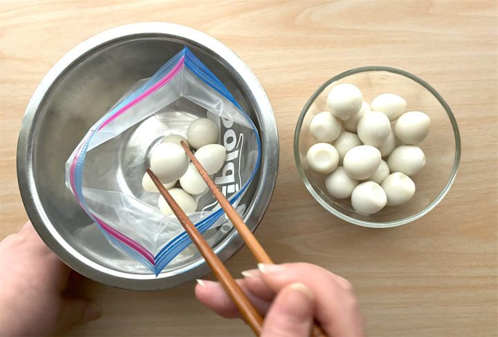 2. うずらの卵に味付けをします。