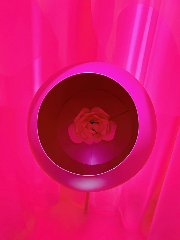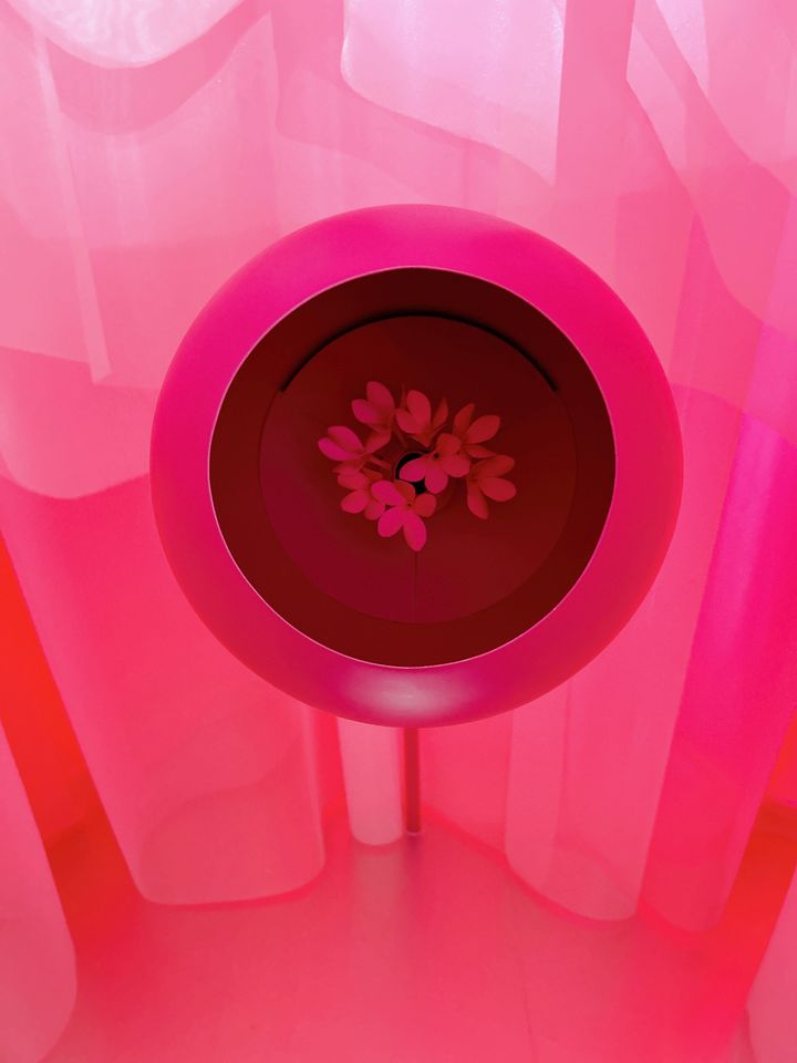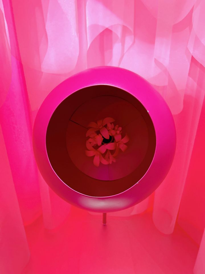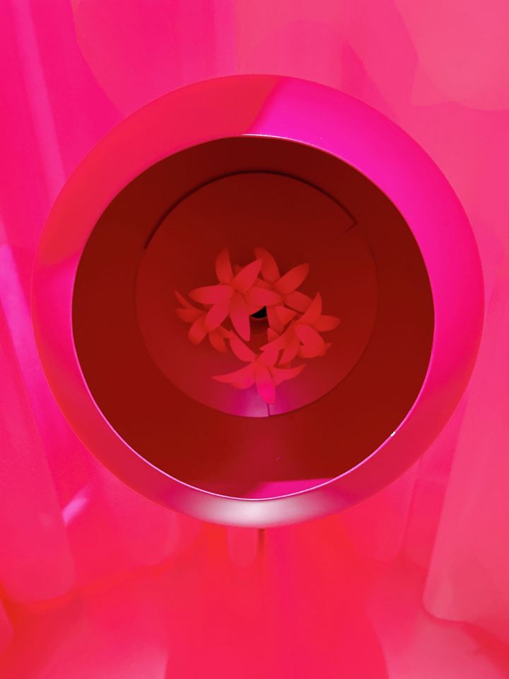 ピンクのガラス越しに、ゆっくり回転する姿をしばらく眺めていました。