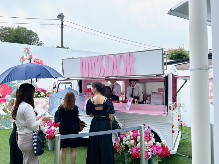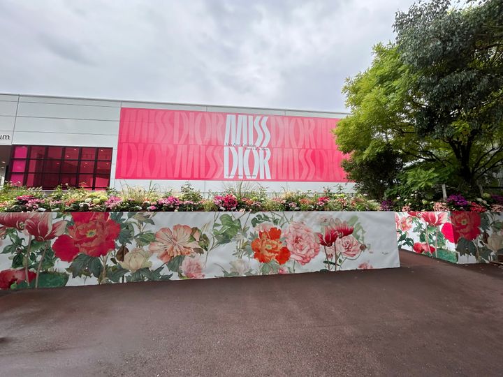 私が行った日は生憎の雨模様でしたが、ミス ディオールの雰囲気にぴったりなかわいらしい外観が印象的でした。