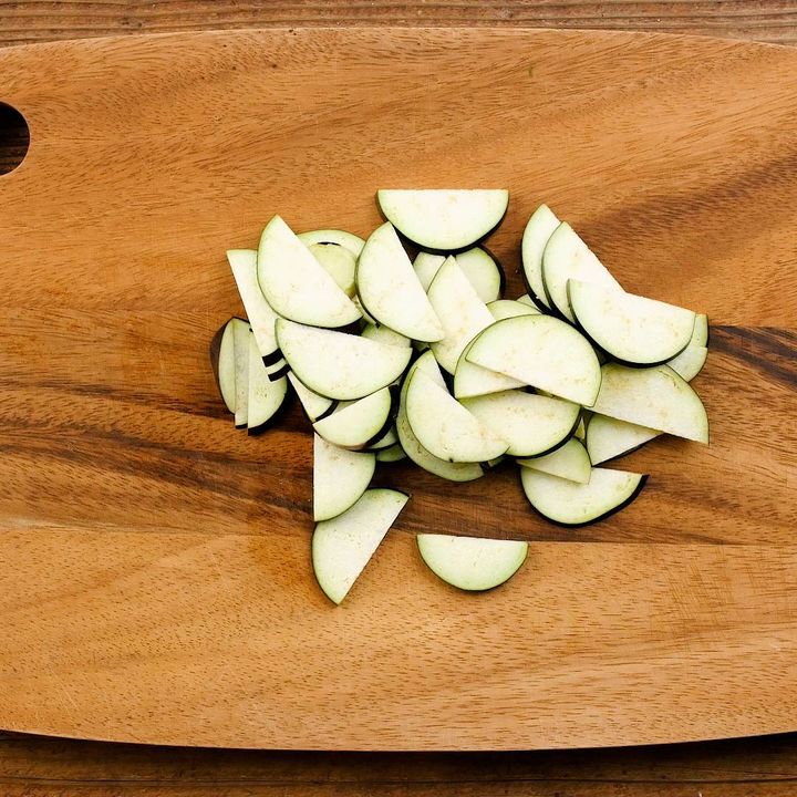 1: なすを5mm幅の半月切りにし、ボウルに移して塩(小さじ1/4杯)をまぶしたら5分ほど置きます。なすがしんなりしたら水気をしぼります。