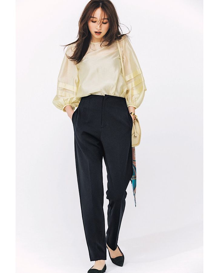 袖にボリュームがある大人可愛いブラウスで、気分を盛り上げたい月曜日。ボトムスには、キレのよいブラックかつシンプルなシルエットのテーパードパンツを。フェミニンテイストのトップスでも、すっきり辛口に着こなせます。足元はベーシックな黒シューズで、きちんと感漂うお仕事コーデに。