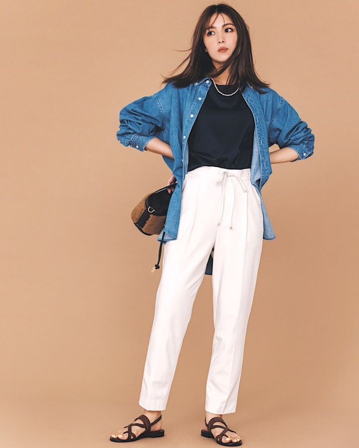 定番コーデ「シャツ×パンツ」のマンネリ化には、「デニムシャツ」をアウター気分で取り入れるのがおすすめ。コーデが真面目になりすぎず、ほどよくカジュアルダウンした着こなしに。きれいめな白パンツに、ネックレスとバッグはあえて女性らしく飾ると、大人可愛く仕上がります。
