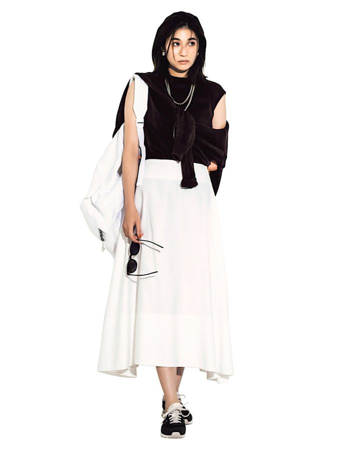 カットソー¥8,800 肩にかけたカーディガン¥30,800(ともにカオス/カオス表参道) スカート¥68,200(マディソンブルー/マディソンブルー) サングラス¥35,200(アイヴァン/アイヴァン 東京ギャラリー) ネックレス¥275,000(タナーズ インディアン アーツ/ロンハーマン) イヤリング¥6,300(アビステ) スニーカー¥10,890(ニューバランス/ニューバランス ジャパンお客様相談室)バックパック¥10,450(THIRD MAGAZINE×OUTDOOR PRODUCTS/THIRD MAGAZINE)
