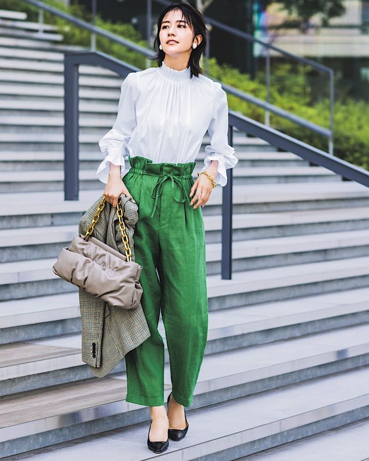 今年顔の鮮やかなグリーンが映えるカラーパンツ。通勤服としてきれいめに着るなら、白の華やぎブラウスで清潔感たっぷりに。シンプルな黒パンプスや、高級感漂うバッグを合わせれば、ジャケットなしでも上品なオフィスコーデが完成します。