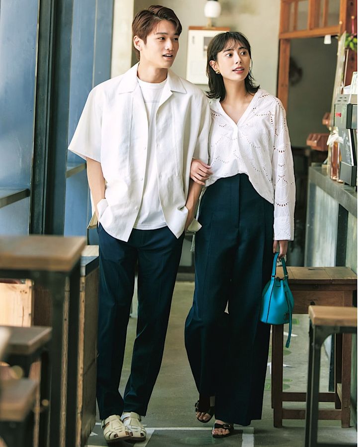 【女性】ブラウス¥22,000(ヌキテパ/パサンド バイ ヌキテパ)ワイドパンツ¥45,100(ebure/ebure GINZA SIX店)バッグ¥174,900サンダル¥94,600(ともにトッズ/トッズ・ジャパン)イヤリング¥21,230(ベンアムン/ZUTTOHOLIC) 【男性】シャツ¥15,400(フューズ/フューズ福岡西通り店)Tシャツ¥13,200(ファクトタム/Sian PR)スラックス¥17,600(アウール/アウール阪急メンズ大阪)サンダル¥39,600(パラブーツ/パラブーツ青山)