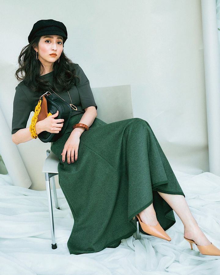 スカート¥47,300(ユニオンランチ/サザビーリーグ)カットソー¥12,100(ウィム ガゼット/ウィム ガゼット ルミネ新宿店)キャスケット¥16,500(ラ メゾン ド リリス/エストネーション)バッグ¥180,400(ピエール アルディ/ピエール アルディ 東京)ミュール¥33,000(ピッピシック/ベイジュ)ピアス¥14,630 ネックレス¥24,310〈ともにソコ〉バングル¥12,870〈ベンアムン〉(すべてZUTTOHOLIC)