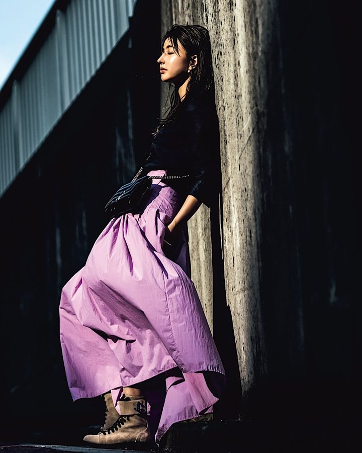 ブーツ¥162,800 バッグ¥188,100(ともにJIMMY CHOO)シャツ¥39,600(マディソンブルー/マディソンブルー) スカート¥28,600(LEPHIL/LEPHIL NEWoMan新宿店) バングル¥15,400(ワンエーアールバイウノアエレ/ウノアエレ ジャパン) ピアス¥13,200(D.U.E/e.m. PRESS ROOM)