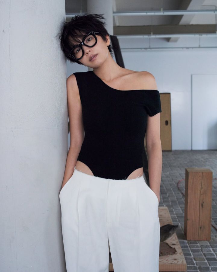 オフショルダーボディ¥19,800(UKI UKI)、トラウザーパンツ¥22,000(ビューティー&ユース/ユナイテッドアローズ 渋谷スクランブルスクエア店)、メガネ¥70,400(MAX PITTION/プライベート アイズ アンド トラッカーズ)、スニーカー¥15,400(アディダス オリジナルス/アディダスお客様窓口)