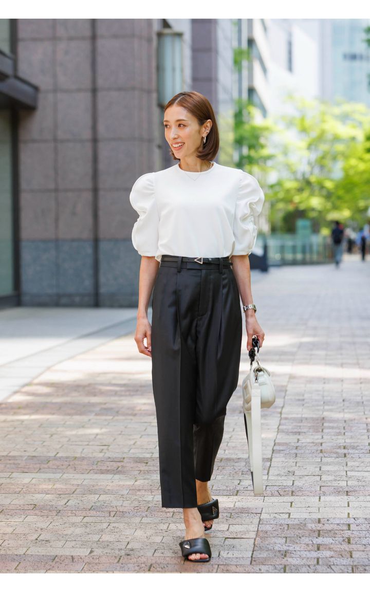 「ピエール アルディのバッグは、ストラップなどに黒が入っていることで白一色よりもモード感がアップするんです。長く使用していますが、汚れがほとんど気にならず、どんなコーディネートでもまとめてくれるので本当に重宝しています」吉原尚子さん・162cm(42歳/11歳と8歳の女の子ママ)