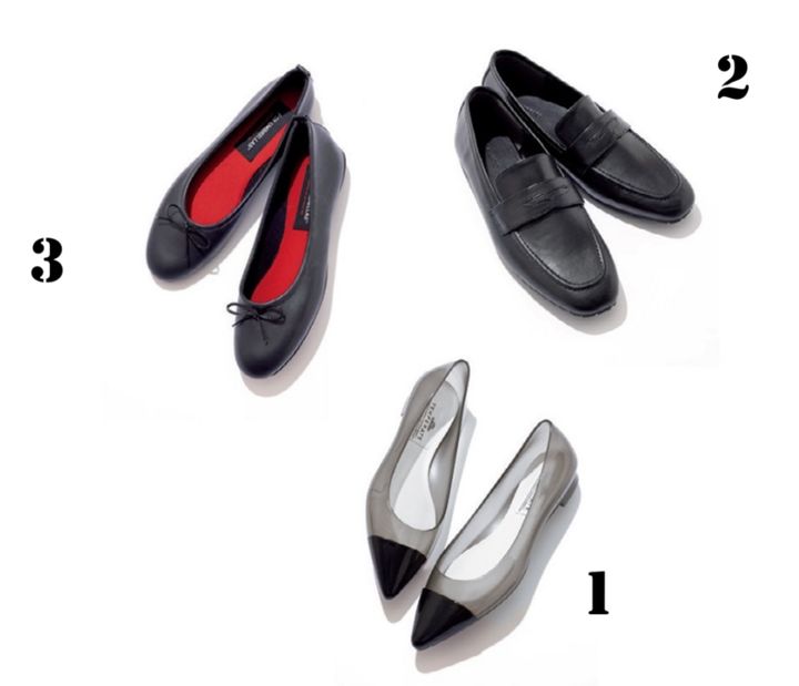 1.半透明バイカラーのポインテッドトゥパンプス7040円(テンパレイト/ル タロン プリュ 有楽町マルイ店) 2.晴雨兼用ローファー4950円(グローバルワーク/アダストリア) 3.ラバーのバレエシューズ1万5400円(フォックスアンブレラズ/グリニッジ ショールーム) ビットローファー8580円(テンパレイト/ル タロン プリュ 有楽町マルイ店)