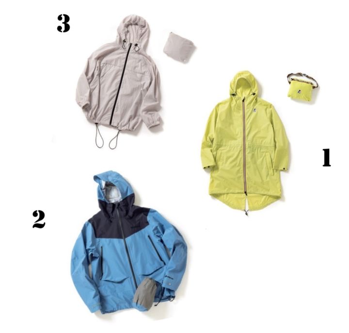 1.フードとウエスト、裾にドローコード入り。グリーン3万6300円(ケーウェイ/ケーウェイ渋谷) 2.透湿性、耐久防水性、防風性を備えた素材を採用。止水ファスナーポケットも。ブルー4万4000円(マーモット/サードシップ) 3.はっ水・抗菌防臭機能のあるパーカ。140 gの軽さで持ち運びに便利。お家洗いも可能。パープル6490円(アーシー/アーシープレス)