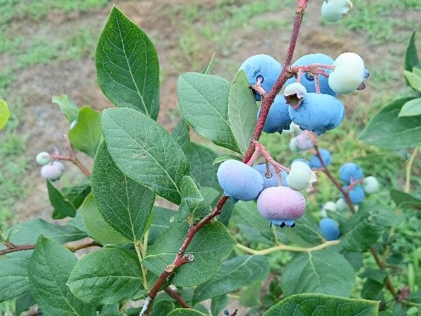 上の写真にはまだ色付かないもの、紫色が入ったもの、そして青く色付いたブルーベリーがあって色付きの過程がわかりますね。