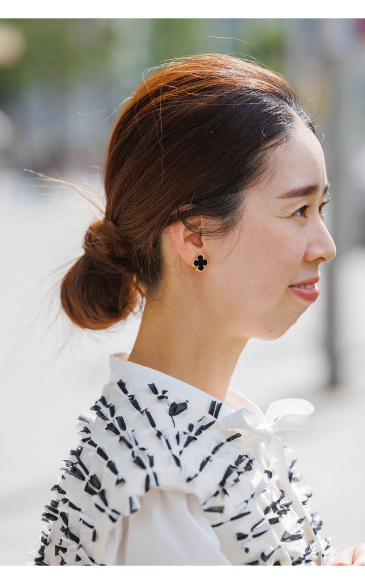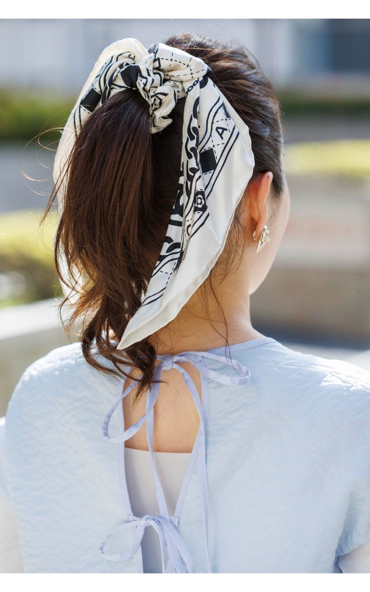 「まず毛先を外巻きにしてからポニーテールにし、トップは少しふんわりさせてシャネルのスカーフを結びます。スタイリング剤は美容院で買ったルベル トリエスプレー5を使用。カチカチに固まらずソフトに仕上がりますが、しっかりキープしてくれるのでダウンスタイルでも使いやすいです」