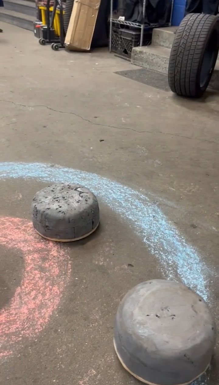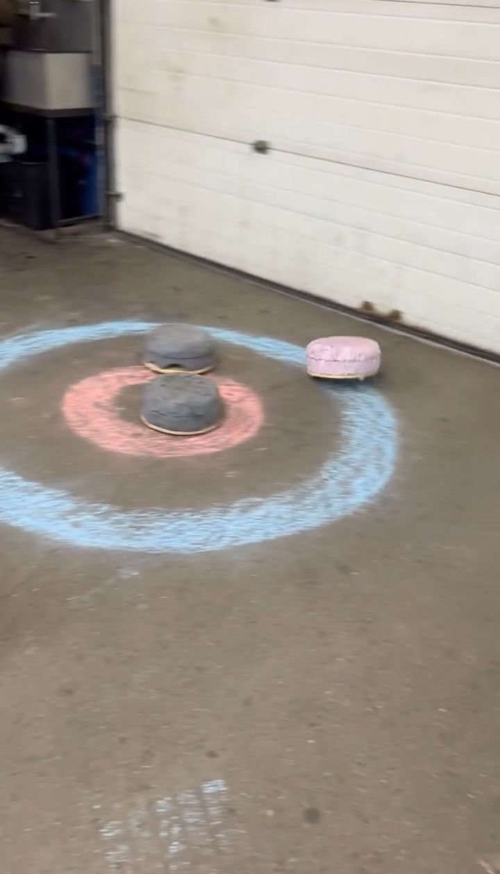 そして、ストーンが進んでいく先にはチョークでサークルが描かれていました。 その中心には、すでにストーンがひとつ止まっていますが・・・