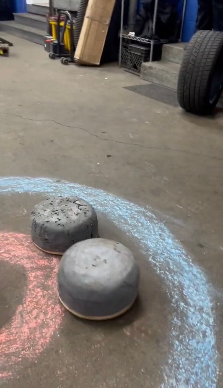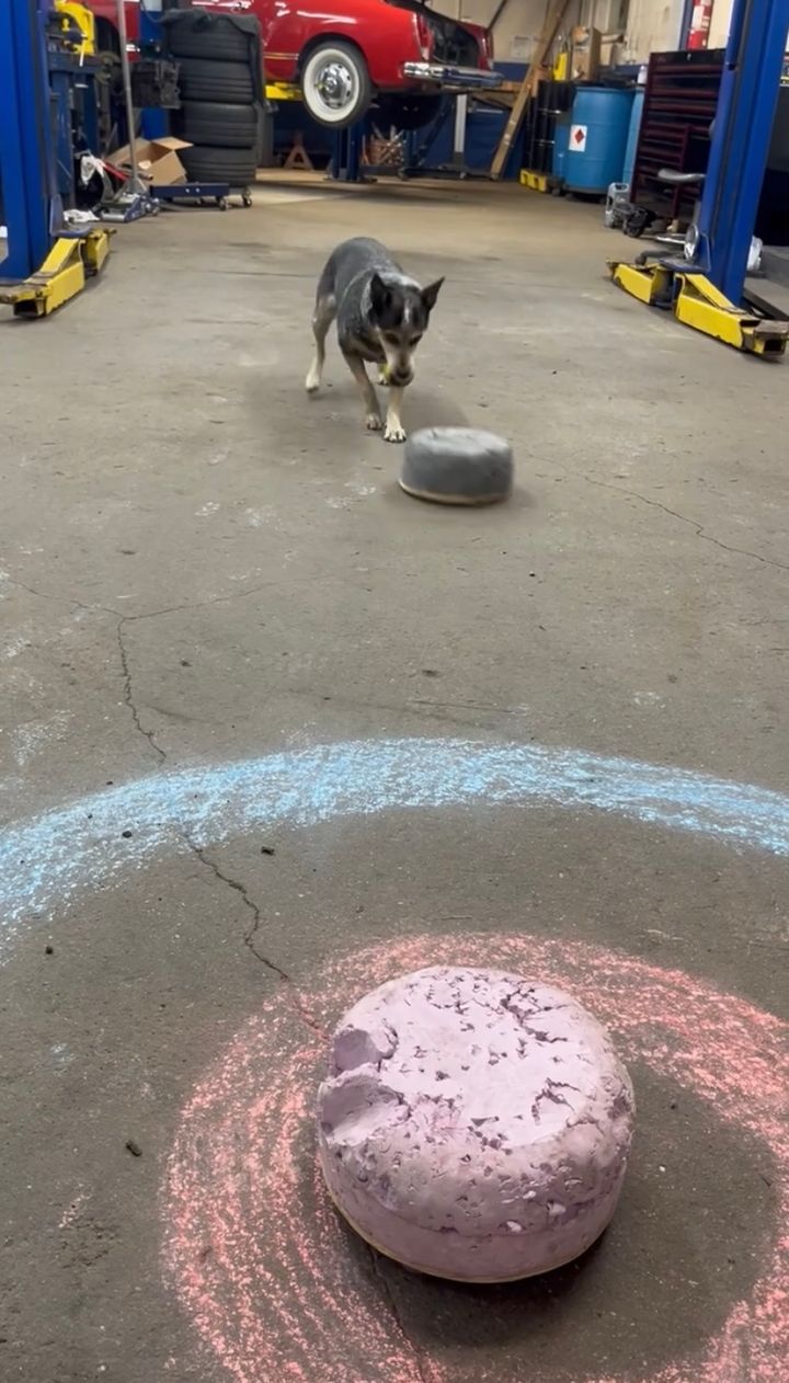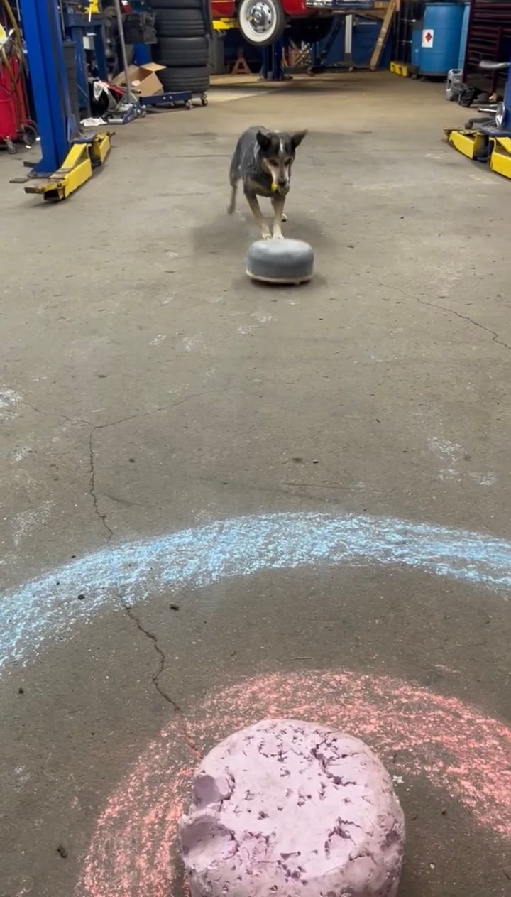 登場したのは、撮影者さんの愛犬『ペッパー』。 この子は、目の前に置いてあるストーンをキックして正面に真っ直ぐ滑らせました。