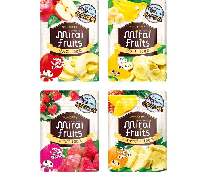 りんご、バナナ、いちご、パイナップルの4種。着色料、香料、甘味料、保存料などは一切不使用の乳児用規格適用商品。対象月齢は9か月頃から。ビタットジャパン ミライフルーツ 各540円(A)