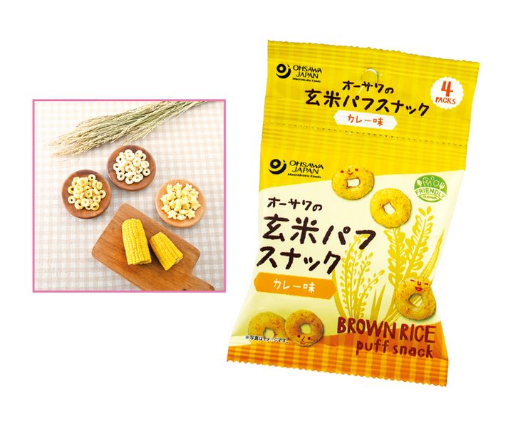 軽い食感で香ばしい玄米のパフスナック。14種類のスパイスをブレンドしたカレー粉と、野菜のうまみを凝縮した野菜ブイヨンを使用した本格的な味も魅力。オーサワジャパン 玄米パフスナック カレー味(8g×4パック) 270円(D)