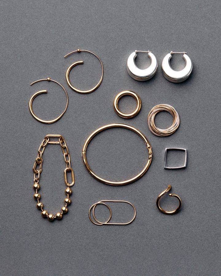 右上から順に:シルバーフープピアス[SV925]¥29,700(アルティーダ ウード/THE ANOTHER MUSEUM)、レイヤードリング[SV×K18YG]¥198,000( トーカティブ/トーカティブ 表参道)、リング[SV925×ゴールドメッキ]¥15,900(アフェクト)、フープピアス[SV×K18YGプレート]¥38,500(バージュエリー/エルディスト)、スクエアリング[K18WG]¥159,500(ヴァンドーム青山/ヴァンドーム青山本店) 、カーブリング[SV925×YGコーティング]¥13,200(ete)、バングル[SV925×ゴールドメッキ]¥29,800(アフェクト)、リング[K18YG]¥112,200(ヒロタカ/ヒロタカ 表参道ヒルズ)、チェーンブレスレット[K14ゴールドプレーティング]¥36,850(パンドラ)
