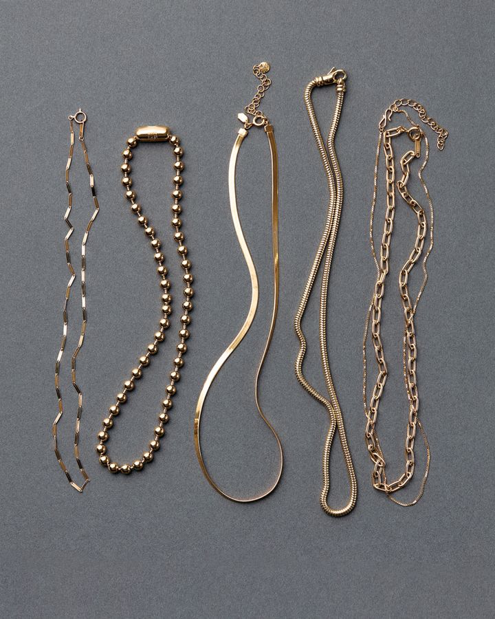 右から:2連ネックレス[SV925×ゴールドメッキ]¥37,900(アフェクト)、ネックレス[SV925×K9YGコーティング]¥91,000 (トムウッド/トムウッド 青山店)、プレートネックレス[SV×K22YGプレート]¥25,300(マリア ブラック/マリア ブラック 表参道店)、ボールチェーンネックレス[SV925×ゴールドメッキ]¥49,500 (マユ/マユ ショールーム)、プレートネックレス[K18YG)¥53,900(ボーニー/エドストローム オフィス)