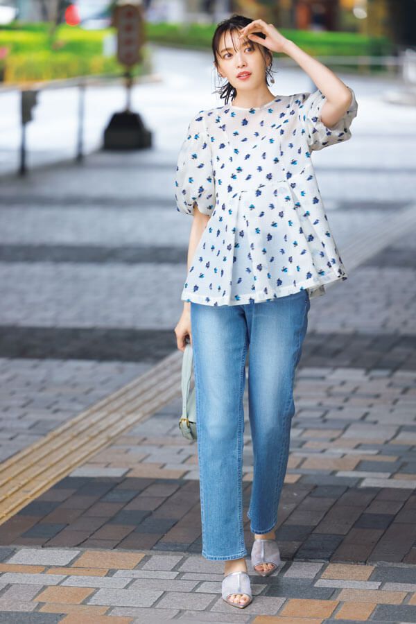 白地に浮かべたブルーフラワーが爽やかフェミニン♡ デニムでラフに着崩して休日仕様に。