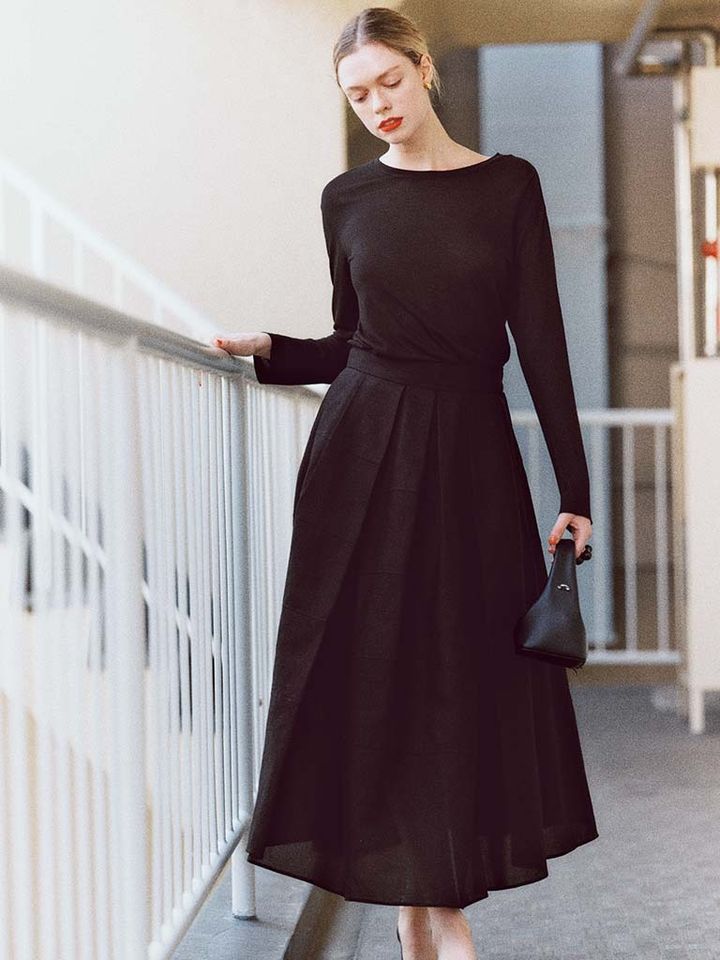 重たく見えない「黒のフレアスカート」広がりすぎずひらつかない美シルエット