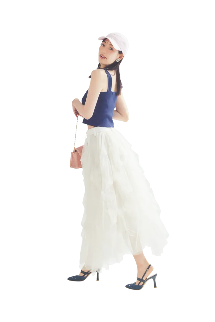 タンクトップは着回し。チュールスカート 22,000円/LA BELLE ETUDE(アンティローザ) キャップ 5,500円/OVERRIDE(OVERRIDE 神宮前) イヤリング 3,990円/アビステ ピンクバッグ 9,900円/RESEXXY キルティングデニムパンプス 17,600円/ダイアナ(ダイアナ 銀座本店)