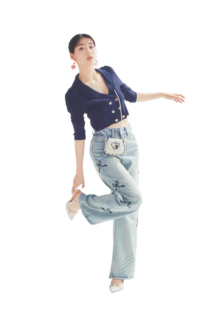 カーディガンは着回し。サイドリボンデニムパンツ 7,900円/MORE self LOVE イヤリング 4,410円/アビステ ステッチハートミニショルダーバッグ 7,920円/ヘイ!ミセスローズ(キャセリーニ) 白パンプス 9,200円/チャールズ&キース(チャールズ&キース ジャパン)