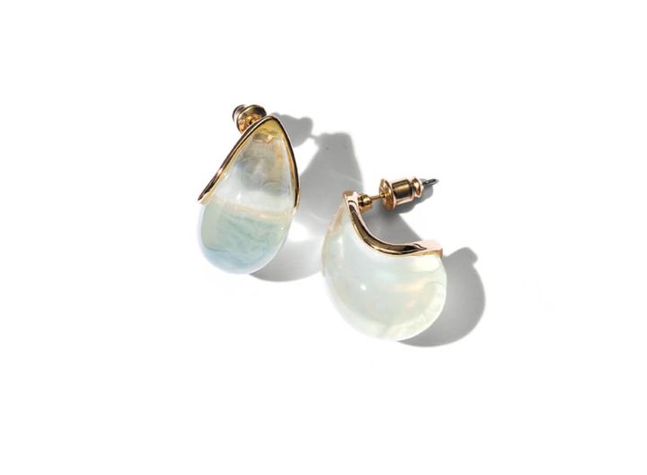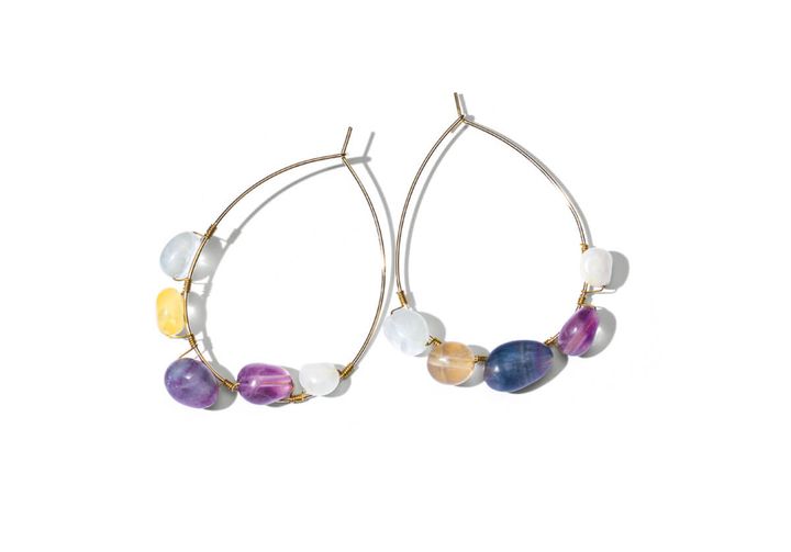 繊細なフープピアスに連ねた不ぞろいのカラーストーンが清涼感満点。