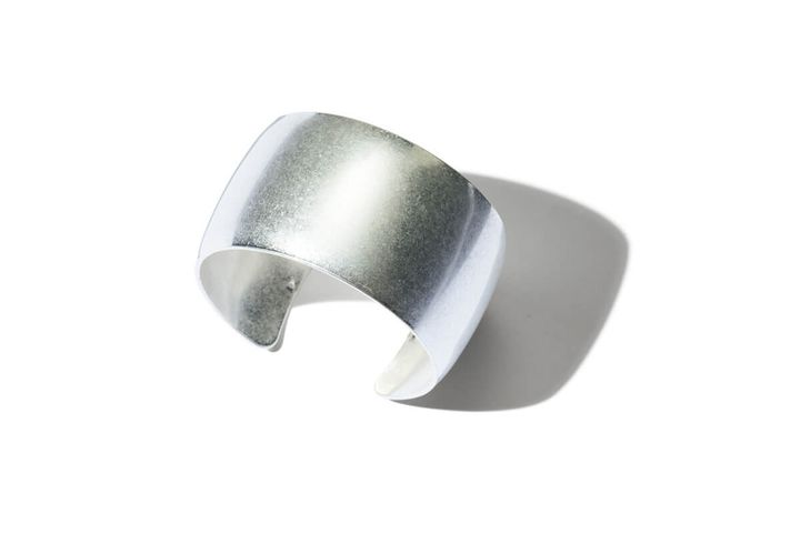 ごつめのシルバーバングルは、こなれ見えするだけでなく、手元をきゃしゃに見せてくれる効果も。