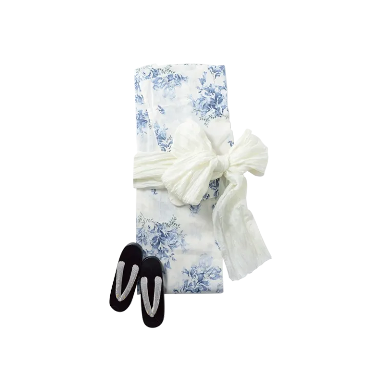 ブルー花柄浴衣と帯のセット(下駄、腰ひも、着付けマニュアルつき)13,990円/Dita 下駄 参考商品/utatane