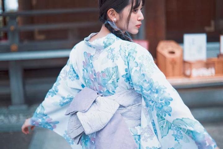 あじさい柄浴衣 19,800円、パープル半巾帯 参考商品/ともに三松 チャームつき飾りひも 参考商品/和風館ICHI イヤリング 4,180円/ミミサンジュウサン(サンポークリエイト) ヘアリボン/スタイリスト私物
