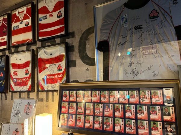 店内にはラグビー選手のサインやユニフォーム、試合に使用したボールなどが飾られていて、ラグビー好きにはたまらない♥