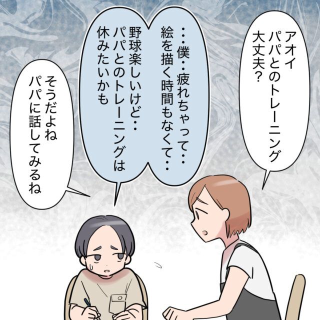 「・・・僕・・疲れちゃって・・絵を描く時間もなくて・・。野球楽しいけど・・パパとのトレーニングは休みたいかも」