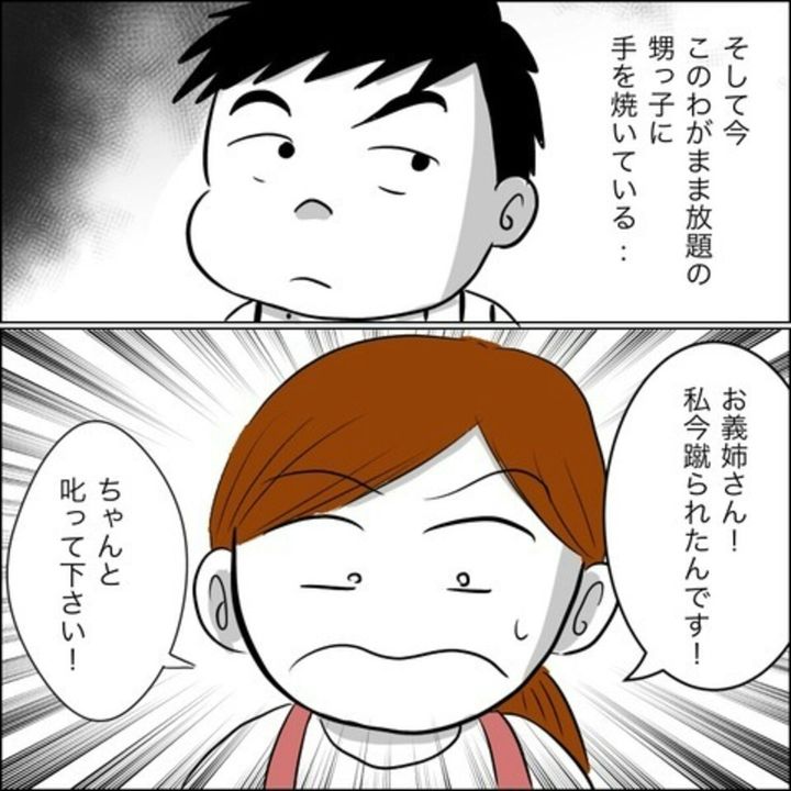 子どもに対する善悪の伝え方は家庭によってそれぞれですが、義姉親子の場合はいけないことをしても諭すことすらせず、主人公家族に迷惑をかけてもまるで気にとめる様子がありません。一方、義姉の息子・カン太は主人公一家になついていて、叱られたとしても一緒に居たいと考えています。また、主人公の夫であるおじに注意されれば謝ることができる子として描かれています。