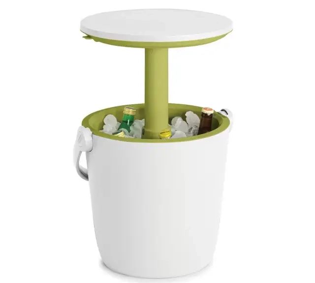 バケツ型で持ち運びもかんたんな、『Keter(ケタ―)』の「クーラーテーブル」。蓋を開けるとテーブルとして使えるので、狭い場所でも活躍します。