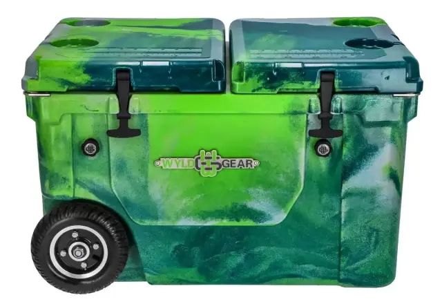 用途に応じて入れたいものを分けることができる、『WYLD GEAR(ワイルドギア)』 のデュアルコンパートメント構造のクーラーボックス。鮮やかなグリーンの目を引くデザインで、蓋の上にドリンクホルダーが付いているのもうれしいポイントです。