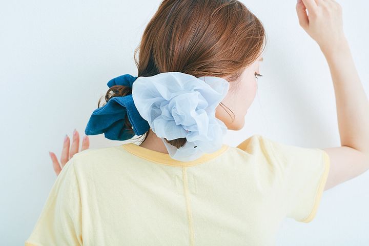タフなデニム×シアーなくすみブルーのデザイン違いのシュシュを組み合わせることで、ミニマルなファッションにメリハリが誕生。
