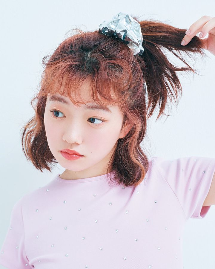 シュシュアレンジは結ぶ位置で印象操作がキホン。低めだと女性らしい落ち着いた雰囲気に。鮮度を高めるなら、トップに結んで人と差をつけて。