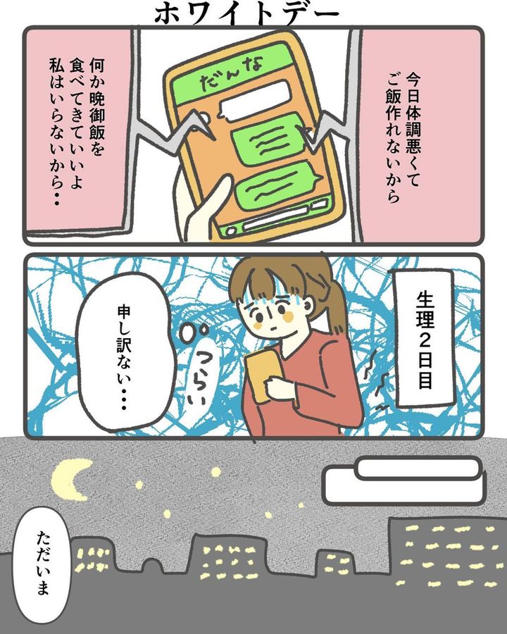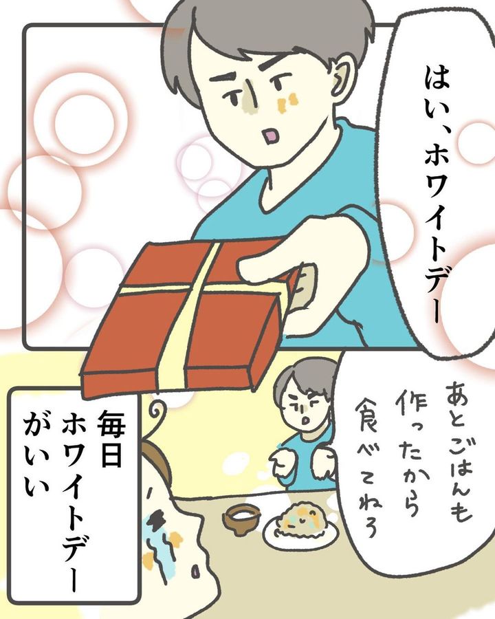 晩ご飯を作れないことを申し訳ないと思うちぇるしーさんと、そんなちぇるしーさんにやさしく接する旦那さん、2人ともとても素敵です。「毎日ホワイトデーがいい」と思う、ちぇるしーさんのうれし泣きが印象的です。