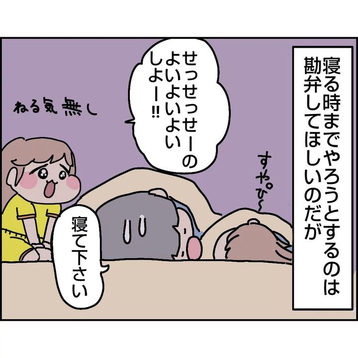 保育園で手遊びを覚えてきたよーちゃん。ぼぶさんと楽しく手遊びをしますが、就寝時にも「せっせっせーのよいよいよいしよー!!」と言い、ぼぶさんを困らせるのでした。