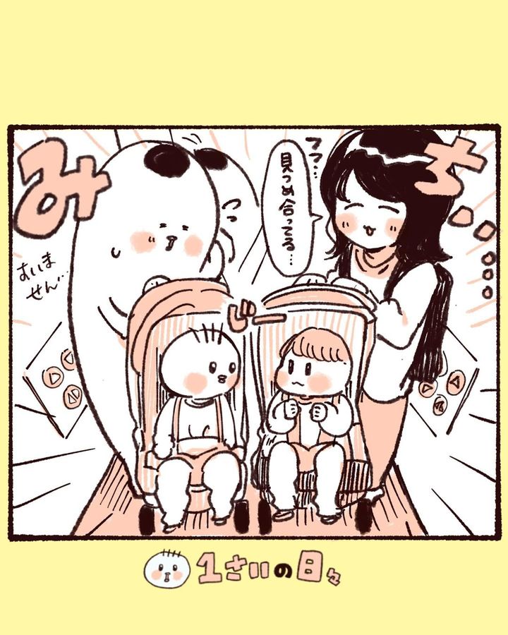 駅のエレベーターで、ベビーカーを押す女性が、「あっ…よければ…乗れますよー!!」。エレベーター内にベビーカーが2台並ぶと、子ども同士がじっと見つめ合っているのでした。
