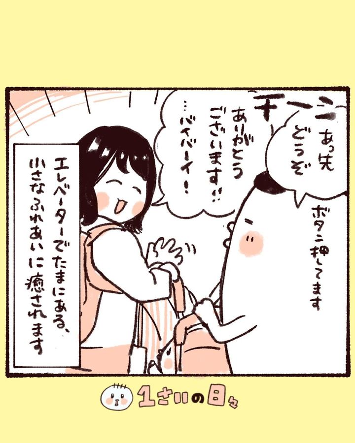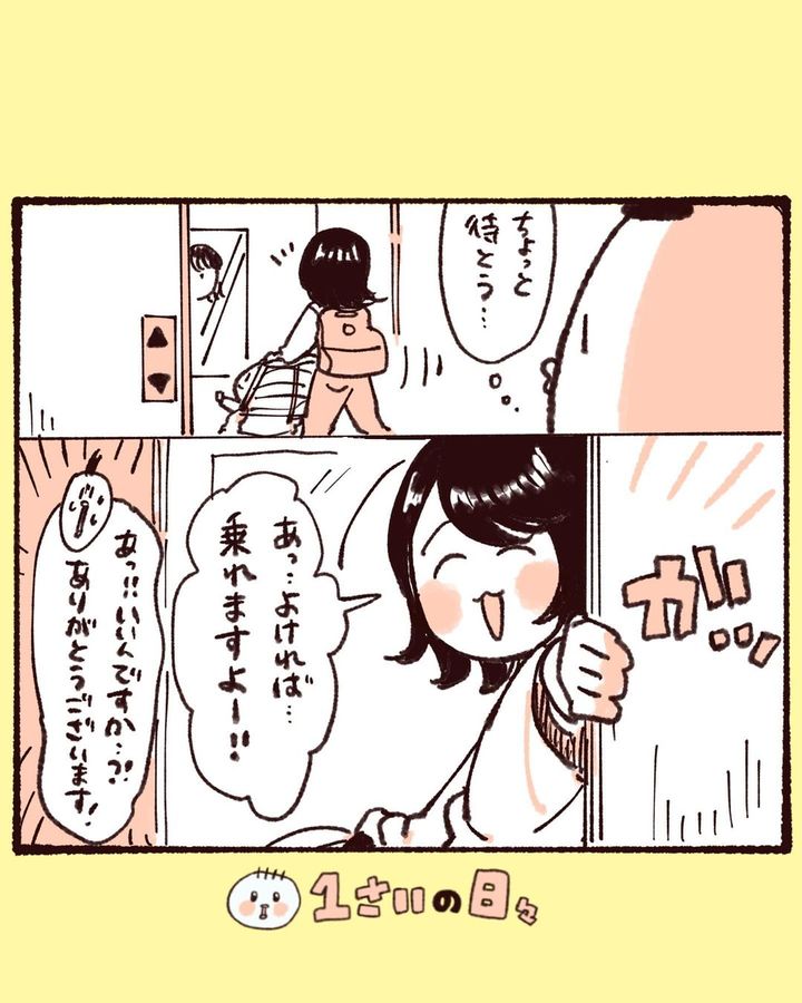 後ろに並んでいたなつさん親子を気遣い、声をかけてくれた女性のやさしさが印象的です。エレベーター内で見つめ合う子どもたちが何とも可愛らしいですね!