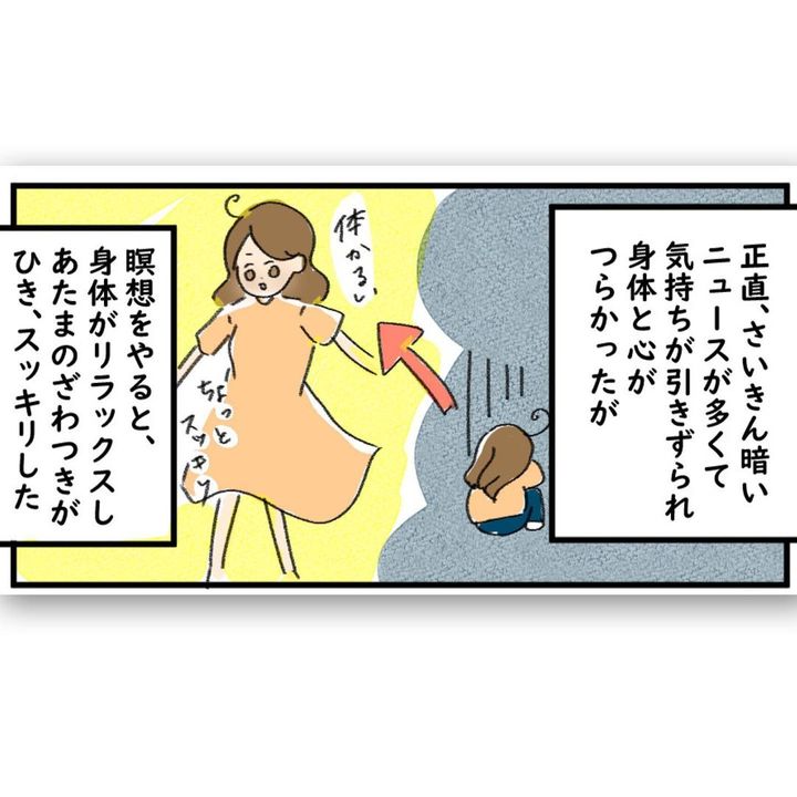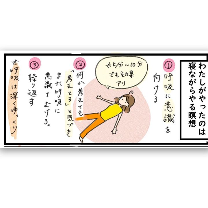 眠れない時の対処法として、「瞑想」を取り入れたちぇるしーさん。呼吸に意識を向けて瞑想すると、リラックスでき、頭の中もすっきりとして、よく眠れるようになったそうです。